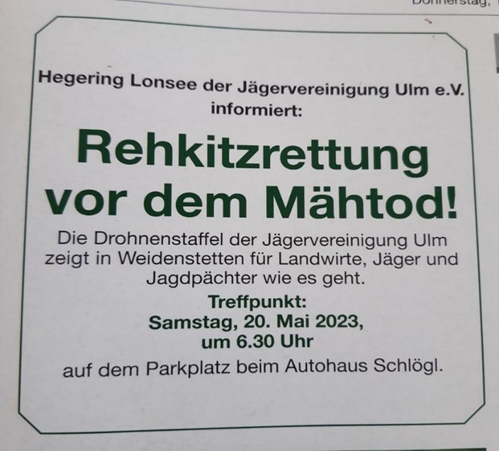 Ausführliche Information über „Kitzrettung“ gibt es auf der Homepage der Jägervereinigung Ulm e.V.