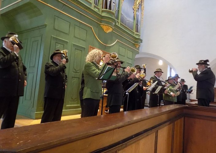 Die Eninger-Bläser in reiterlicher Fest-Uniform trugen formiert um den Altar
