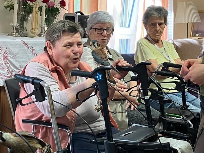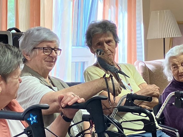 Voller Begeisterung und neuem Wissen endete dieser Nachmittag damit, dass Floki - der kleine Buntfalke - noch auf die eine oder andere Hand eines Besuchers fliegen durfte.
